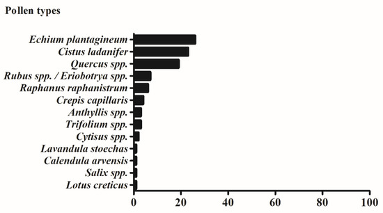 As expected, grains from different plant species were identified, which allows the pollen sample to be classified as heterofloral [8] (Figure 1). Particularly, thirteen different grain types were distinguished in the studied sample. Among them, Echium plantagineum, Cistus ladanifer and Quercus species were the predominant ones, with relative abundance percentages of 26, 23, and 19%, respectively. Other pollen types detected include Rubus spp., Eriobotrya spp., Raphanus raphanistrum, Crepis capillaris, Anthyllis spp., Trifolium spp., Cytisus spp., Lavandula stoechas, Calendula arvensis, Salix spp. And Lotus criticus. The obtained results are in line with the wide plant diversity observed in the Abrantes region. In fact, this area has a mixed forest of Echium, Castanea sativa and Quercus spp., Leguminosae scrubs (Cytisus spp.), and Rubus plants, which often colonize abandoned agricultural fields [9]. Additionally, the presence of these grain types would contribute to the dark blue color exhibited by honeys from this region [10]. These pollen grains have also been identified in other Portuguese samples, but at different proportions, depending on the region [2,5,9]. Particularly, honeys from Trás-os-Montes and Serra de Aire e Candeeiros are also richer in Echium plantagineum pollen grains [9,22], while honeys from Castelo Branco are mainly composed of Lavandula and Echium types (93.75 and 81.25%, respectively) [10]. On the other hand, Caramulo and Luso regions showed higher amounts of Eucalyptus spp. [5,23], while C. sativa is the most abundant grain type in Bragança samples [24]. Regarding other countries, Rubus, C. sativa, and Cytisus species are the predominant pollen grains in Spanish honeys [25], while Brazilian ones mainly consist of Arecaceae, Asteraceae spp., and Brassicaceae grains [8]. In addition to those already mentioned, it is important to note pollen composition is not only strongly influenced by floral species, but also by growth conditions and cultivation techniques [8]. On the other hand, its quality mainly depends on the harvesting, cleanliness, dryness, and storage procedures applied by beekeepers to increase shelf-life [2].