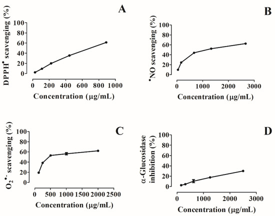 Effects of pollen hydroethanolic extracts against (A) 1,1-diphenyl-2-picrylhydrazyl (DPPH●), (B) nitric oxide (●NO), (C) superoxide (O2●−), and (D) α-glucosidase inhibition activity.