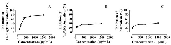 Inhibition of (A) hemoglobin oxidation, (B) lipid peroxidation, and (C) hemolysis of human erythrocytes by extracts of pollen hydroethanolic extracts.