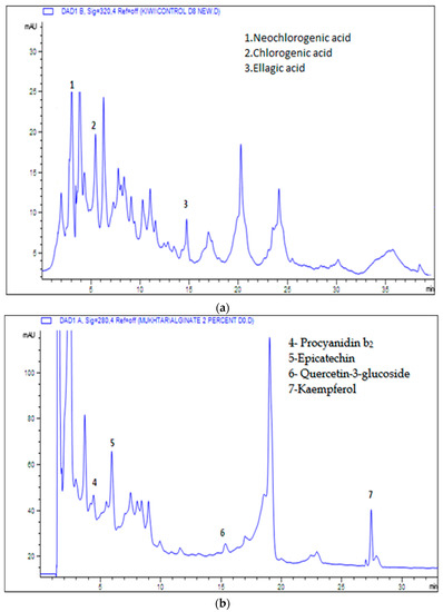 Abiotic stress on fruits is thought to be caused by edible coatings, which modify their metabolism and influence the production of phenolic and flavonoid chemicals (secondary metabolites) [36]. These coatings result in the accumulation of phenolics and ascorbic acid, as indicated already, thereby causing increases in antioxidant activity (Table 2) [37], supporting our results showing increased antioxidant activity in coated samples. Representative HPLC chromatograms of kiwi fruit slices showing polyphenols at 320 nm and 280 nm are shown in Figure 1a,b.