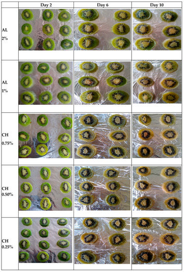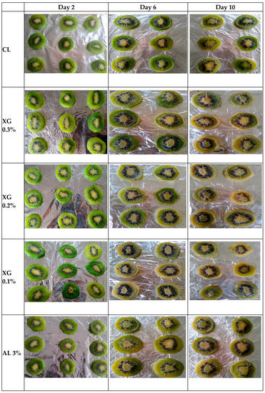 Changes in the appearance of polysaccharide-based coated kiwi fruit slices during storage are shown in Figure 2.