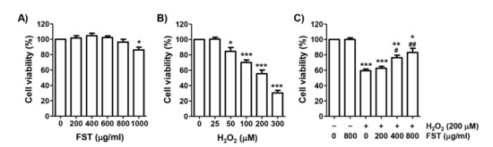 To investigate the effect of FST on cytotoxicity in H2O2-stimulated MC3T3 cells, cell viability after treatment with FST and H2O2 alone was first measured using the MTT assay. Figure 1A showed that FST has no cytotoxicity up to 800 μg/mL in MC3T3 cells, but a slightly cytotoxic effect at 1000 μg/mL. On the other hand, cell viability was gradually decreased with the increasing concentration of H2O2 used for treatment. Cells treated with 200 μM H2O2 showed the viability of about 60% (Figure 1B). Therefore, the treatment concentration of H2O2 to suppress cell viability was selected to be 200 μM and the maximum concentration of FST to investigate its protective effect was set to be 800 μg/mL. Figure 1C showed that FST markedly attenuated the decreasing viability by H2O2 in a concentration-dependent manner (Figure 1C).