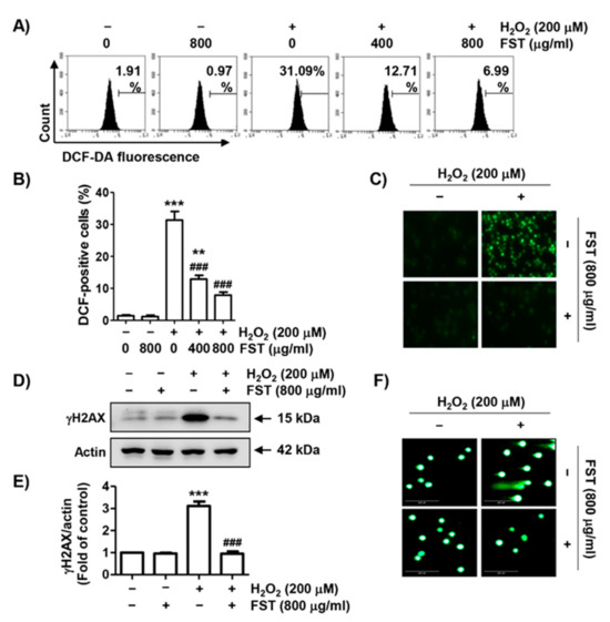 The effect of FST against H2O2-induced DNA damage was assessed. Figure 2D,E showed the expression level of phosphorylated nuclear histone H2A.X protein (γH2A.X) was strongly up-regulated in H2O2-treated cells. However, its expression was not induced by FST. Additionally, migration of damaged DNA fragments by electrophoresis was distinctly observed following by H2O2. However, these DNA tails were not generated in cells pretreated with FST (Figure 2F). The result suggested that the protective effect of FST against DNA damage caused by H2O2 might be contributed to the inhibition of ROS production.