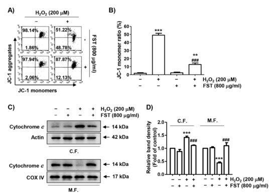 Effect of FST on mitochondrial damages in H2O2-stimulated MC3T3-E1 cells. Cells were pre-treated with or without FST (800 μg/mL) and exposed to H2O2 (200 μM) for 24 h. (A,B) Mitochondrial membrane potential (MMP) was measured by flow cytometry after 5,5′6,6′-tetrachloro-1,1′,3,3′-tetraethyl-imidacarbocyanine iodide (JC-1) staining. (A) Representative profiles are shown. (B) Ratios of JC-1 aggregates to monomers are expressed. ** p < 0.01 and *** p < 0.001 vs. control cells. ### p < 0.001 vs. H2O2-treated cells. (C) The expression of cytochrome c in mitochondrial (M.F.) and cytoplasmic fractions (C.F.). Cytochrome c oxidase subunit IV (COX IV) and actin were analyzed as internal controls for mitochondrial and cytosolic fractions, respectively. (D) Relative band density. *** p < 0.001 vs. control cells. ### p < 0.001 vs. H2O2-treated cells.