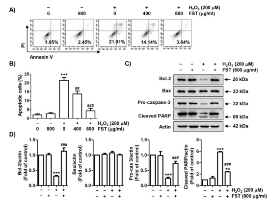 Protective effect of FST on apoptosis in H2O2-stimulated MC3T3-E1 cells. Cells were pre-treated with or without FST (800 μg/mL) and exposure to H2O2 (200 μM) for 24 h. (A,B) Cells were stained with annexin V and propidium iodide (PI) and then analyzed by flow cytometry. (A) Percentages of apoptotic cells are shown as annexin V-positive cells. (B) Quantitative analysis of apoptotic cells in percentage. *** p < 0.001 vs. control cells. ## p < 0.01 and ### p < 0.001 vs. H2O2-treated cells. (C) The expression of apoptosis regulators. Actin was used for loading control. (D) Relative band density of apoptosis regulators. ** p < 0.01 and *** p < 0.001 vs. control cells. ### p < 0.001 vs. H2O2-treated cells.