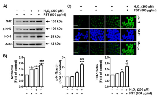 Next, we evaluated whether the Nrf2 signaling pathway was associated with the antioxidant activity of FST. As indicated in Figure 5A,B, Nrf2 expression was partially increased in FST alone or H2O2 alone-treated cells. However, its expression was markedly increased when FST and H2O2 were treated together. The phosphorylation of Nrf2 was slightly up-regulated by H2O2 treatment, while the expression was markedly enhanced by FST and H2O2. In addition, the expression of heme oxygenase-1 (HO-1), a representative downstream regulator of Nrf2, was improved in the co-treatment cells. Furthermore, through immunofluorescence experiments, it was confirmed that p-Nrf2 was uniquely expressed in the nucleus rather than in the cytoplasm of cells co-treated with FST and H2O2 (Figure 5C). These results indicate that Nrf2 could be transferred to the nucleus after phosphorylation to act as a transcription factor to induce the transcriptional activity of HO-1 in the co-treatment cells with FST and H2O2.