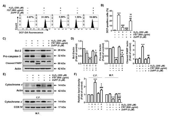 In order to elucidate the contribution of the Nrf2/HO-1 signaling pathway in the benefit of FST against the H2O2-induced cytotoxic effect, MC3T3-E1 cells were pretreated with the HO-1 antagonist, ZnPP, and then incubated with FST and H2O2. As shown in Figure 6A,B, the inhibitory effect of FST on H2O2-induced ROS generation was significantly reduced in the presence of ZnPP. At the same time, in the presence of ZnPP, the inhibitory efficacy of FST on the suppression of expression of Bcl-2 and pro-caspase-3, cleavage of PARP and cytochrome c leakage from mitochondria to the cytoplasm were also abrogated (Figure 6C–F). The suppressive efficacy of FST on H2O2-mediated apoptosis was also abolished by ZnPP (Figure 7). These results suggest the notion that FST protects against oxidative stress-induced cellular damage by stimulation of the Nrf2/HO-1 pathway in MC3T3-E1 cells.