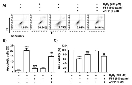 Effect of ZnPP on FST-induced protection of apoptosis and cytotoxicity by H2O2 in MC3T3-E1 cells. Cells were pretreated with the ZnPP (5 μM) with or without FST (800 μg/mL) for 1 h and then subjected to treatment with H2O2 (200 μM) for 24 h. (A,B) Cells were double-stained with annexin V /PI and then analyzed by flow cytometry. (A) Percentages of apoptotic cells are shown as annexin V-positive cells. (B) Quantitative analysis of apoptotic cells. (C). Cell viability. (B,C) *** p < 0.001 vs. control cells. ### p < 0.001 vs. H2O2-treated cells. $$ p < 0.01 and $$$ p < 0.001 vs. H2O2 and FST-treated cells.