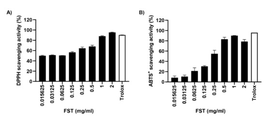 Antioxidant capacity of FST. (A) DPPH radical scavenging activity of FST. (B) ABTS radical scavenging activity of FST (B). Trolox (0.1 mg/mL) was used as the positive controls. Data are represented the mean ± standard deviation of two independent experiments.