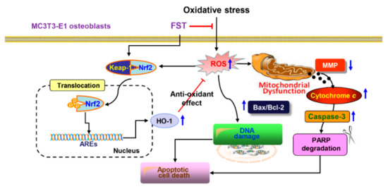 Herein, we evaluated the efficacy of FST on oxidative stress-enhanced cellular damage and apoptotic cell death using H2O2 to mimic oxidative stress in MC3T3-E1 osteoblastic cells. The present findings showed that FST markedly blocked H2O2-induced cytotoxicity, which was due to its ROS scavenging activity. We also demonstrated that the antioxidant activity of FST was accompanied by activation of the Nrf2/HO-1 pathway.