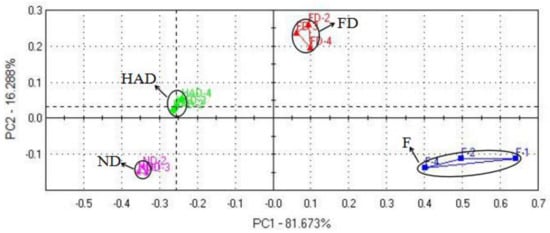 The electronic nose obtains comprehensive flavor information within a short time by mimicking the human olfactory system [20]. It was used for classifying and monitoring the drying process of L. edodes [14,21]. Principal component analysis (PCA) is a multivariate chemometric method that can be used to identify the correlation patterns of constituent variables involved in the distinction between samples [16]. PCA also can provide a better visualization and highlight the differences in volatile profiles. As shown in Figure 1, the accumulative variance contribution rate of the first two PCs was 93% (PC1 accounted for 81.67% and PC2 accounted for 16.29%), which indicated the feasibility of PCA and the two main components contained most of the information about volatile compounds [22]. Despite sensor instability among replications, volatile profiles from different samples were located into four separated areas. FD samples located in the positive axis of PC1, while both ND and HAD samples were in the negative axis of PC1, which indicated that the volatile compounds of ND and HAD samples were significantly different from those of FD samples. These results also showed that the drying processes altered shiitake mushroom aroma profiles.