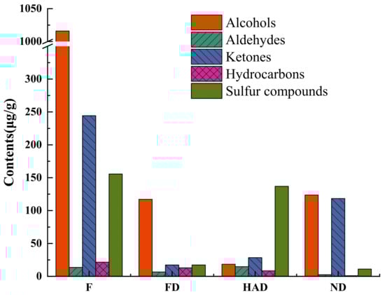 It has been reported that alcohols, aldehydes and ketones played important roles in flavor profiles of foods [9,10,23,24]. As shown in Table 1, the contents of alcohols, aldehydes and ketones in fresh, FD, HAD and ND were 1273.89 µg/g, 141.14 µg/g, 61.58 µg/g, and 244.74 µg/g, respectively. However, the contents of alcohols and ketones significantly decreased after the drying process. Similar results were reported in other mushrooms [9,10]. As shown in Figure 2, alcohols were the highest in fresh samples, but decreases were shown, especially in HAD mushroom samples. The content of aldehydes in HAD mushroom samples increased slightly in comparison with fresh samples. This may be due to aldehydes mainly derived from the oxidation and degradation of unsaturated fatty acids [25]. In addition, increasing the temperature of L. edodes samples may also promote Maillard reaction, including Strecker degradation, which increased aldehyde content [26]. The content of ketones in FD samples was the lowest. It was reported that ketones are mainly obtained from the Maillard reaction and the oxidation and degradation of unsaturated fatty acids [27], and ketones can also be produced by degradation of esters [28]. However, in this study, the most probable route may be through enzymatic reactions. The preservation or formation of ketones in L. edodes was not conducive when the FD temperature was not appropriate [14].
