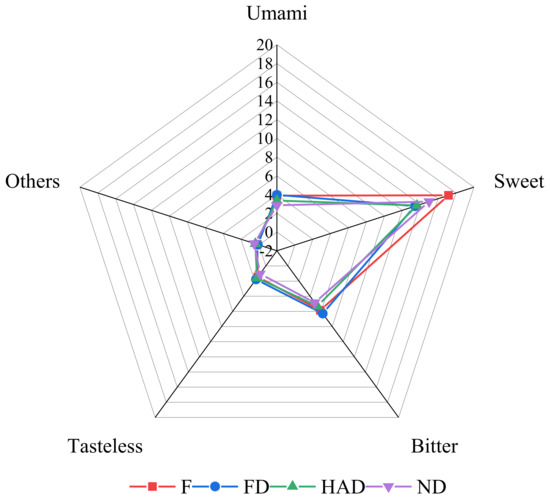 Free amino acids were classified into umami, sweet, bitter and tasteless based on their taste properties [39]. As shown in Table 3, threonine was the highest sweet amino acid, accounting for 77% to 87%, while glutamic acid was the highest umami taste amino acid. The results are similar to others [36]. The contents of aspartic acid were significantly increased in FD samples compared with fresh, HAD and ND. As revealed in Figure 3, fresh Lentinus edodes contained the sweetest amino acid taste, while the FD sample was the most umami-like and bitter tasting amino acid.