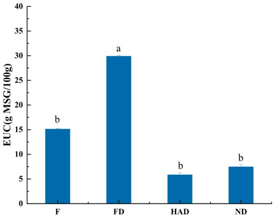 Equivalent umami concentration (EUC) values of fresh and different dried L. edodes; F: fresh sample; FD: freeze drying sample; HAD: hot-air drying sample; ND: natural drying sample. Means with different letters (a, b) are significantly different (p < 0.05).