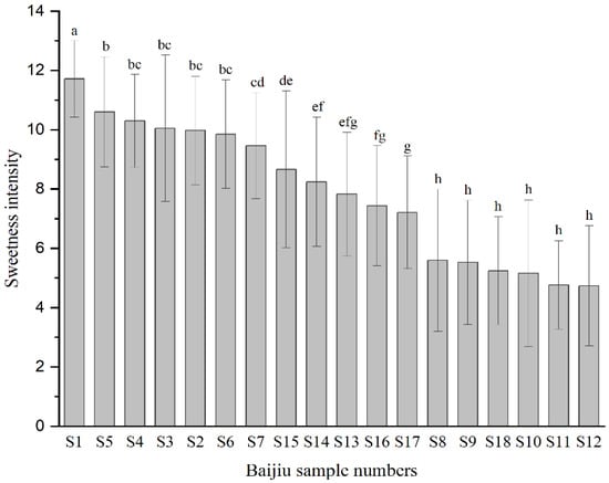 Sweetness intensities of the 18 Baijiu samples. Sweetness intensity was evaluated by 12 sensory panelists using a scale from 0 (none) to 15 (strong). Values are the mean ± standard deviation (SD). The different letters indicate significant differences at p < 0.05.
