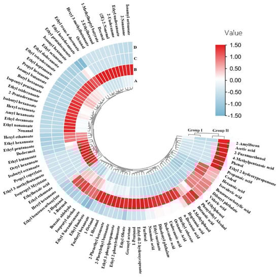 Heat map of aroma compound content of the four fractions distilled from (vacuum condition: A-800 hPa, B-600 hPa, C-400 hPa, D-200 hPa) Baijiu sample S1. Group I and Group II are distinguished by cluster analysis of composition of different fractions: fraction A and fraction B were clustered into Group I, indicating that the two fractions had similar composition (Group II in the same way). Value: standardized value of the concentration of compounds.