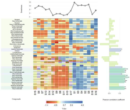 Visualization figure of the correlation between the contents of 43 aroma compounds and sweetness intensity of the 18 Baijiu samples. Compounds: The compounds in Group 1 that are significantly higher concentration (fraction A and fraction B) than in group 2 (fraction C and fraction D) were selected (the data of reactive concentration and visualization figure of these compounds are shown in Table S3 and Figure 2). Sweetness: the sweetness intensities of the 18 Baijiu samples. Value: The value is a normalized value of relative concentration of 43 compounds, which were visualized by heatmap. Pearson correction coefficient (PCC): a value was used to indicate the correlation between the concentration of compounds and sweetness—** highly significant positive correlation (PCC ≥ 0.6), * significant positive correlation (PCC ≥ 0.5).