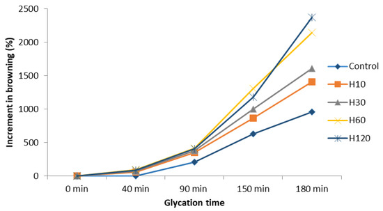 Browning is the result of melanoidin formation and was studied in this work as a measurable parameter indicating the extent of the Maillard reaction. Browning intensity was similar in all samples during the first 40 min of the reaction, increasing significantly thereafter, mainly when H60 and H120 were used as a source of amino groups (Figure 1). Although heated glucose was not used as a control, sugar caramelization is not probably involved in the increased browning, as observed by Laroque et al. [19] and Morales and Jiménez-Pérez [10]. Whereas melanoidins can have Mws higher than even 100 kDa [11], the Mw profiles obtained at 420 nm (Table 2) indicated that the increment in browning was mainly produced by the formation and accumulation of low Mw brown-colored compounds, as previously reported [11,33].