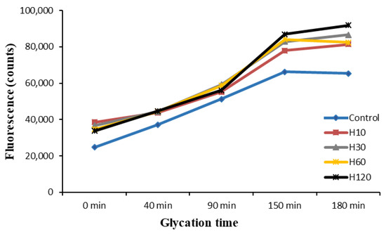A considerable accumulation of fluorescent intermediate molecules was observed from the first minutes of glycation of the control sample before brown pigments were significantly generated (Figure 1). This suggests that these fluorescent intermediates could be precursors of the low Mw melanoidins formed in more advanced steps [10,21,36,38]. From min 40 to 150 of the reaction, fluorescence increased dramatically together with the increase in browning, indicating the concomitant formation of fluorescent and colored intermediate MRPs. During the last 30 min of reaction, in all samples, fluorescence either suffered a slight increase (H10, H30, H120) or remained stable (control and H60), suggesting that the fluorescent intermediates are rather stable upon prolonged heating.