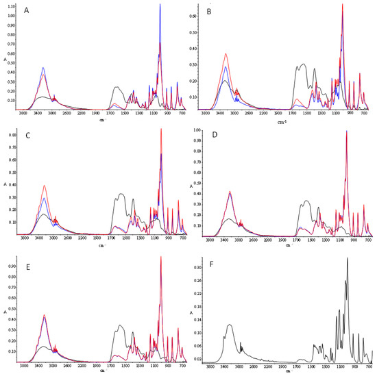 FTIR spectra of control (A), H10 (B), H30 (C), H60 (D), and H120 (E) samples. Black, blue, and red lines represent the non-glycated samples and the samples subjected to reaction with glucose for 40 min or 180 min, respectively. Figure (F) represents the spectrum of glucose.