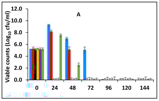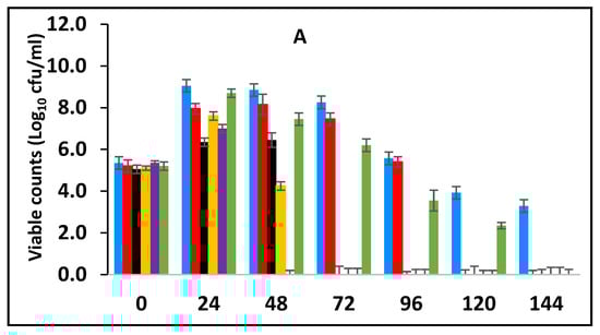 In this section, the effect of subsequent storage at 25 °C on the survival of E. fergusonii in the milk fermented at 25 °C in the presence of various concentrations of BPE and CE was determined (Figure 3A). Traditionally farmers add some spices during milk fermentation mainly for their aroma and flavour but also possibly to control the growth of any pathogens in the milk. Milk is fermented in the warmer part of the house (25–30 °C) and after fermentation, the farmer stores the fermented milk at room temperature (20–30 °C) for a period between three to five days before consumption [49]. L. delbrueckii subspecies bulgaricus and S. thermophilus were incorporated with BPE together with CE and subsequently, the samples were maintained at 25 °C (Figure 3) simulating African room temperatures and practice for both fermentation and storage of the product which effectively extended the fermentation time. Figure 3 shows that the treatments which included both BPE and CE had a highly significant effect (p < 0.001) on E. fergusonii and the bacterium was not detected after 24 h of storage in the samples containing 0.375% BPE combined with 0.0625% CE. In the samples containing 0.25% BPE combined with 0.125% CE the organism was not detected after 48 h of storage. There was also a significant interaction between treatment and storage time (p < 0.001).