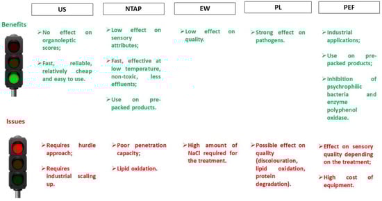 Non-thermal technologies are able to significantly inactivate microorganisms in food, extend shelf-life without significant changes in sensory perception and maintain the nutritional value of the processed food []. Among the main non-thermal inactivation techniques studied to be applied for fish products, non-thermal atmospheric plasma (NTAP), pulsed electric fields (PEF), pulsed light (PL), ultrasound (US) and electrolysed water (EW) are described in the following sections, the benefits and the limits of each method are highlighted and the potential positive or negative effect on the quality of the treated products is underlined.