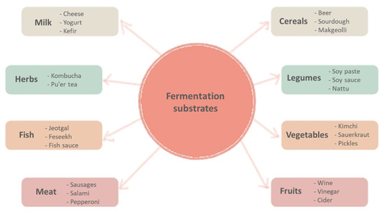 Fermentation involves the action of enzymes and catalysts derived from microorganisms such as bacteria, yeast, and moulds for the chemical transformation of the complex organic compounds in the substrate into simpler, bioactive, functional, and nutritious compounds [10]. There are several classification methods for fermented foods and beverages, mainly based on the substrate category used, such as fermented milk, cereal, legumes, vegetables, fruits, meat, fish, and herbs [11]. The various combinations of different types of food substrates and the involved fermentation microbiota give rise to thousands of fermented products worldwide; the main examples of common fermented foods and beverages and the main fermenting microbes are summarised in Figure 1.