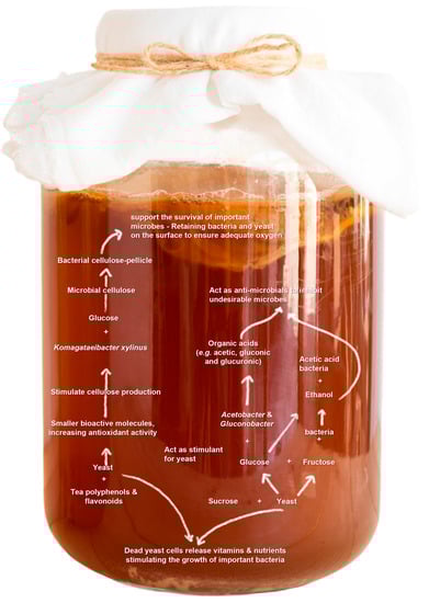The microbial cellulose produced by Komagataeibacter xylinus (formerly Gluconacetobacter xylinus) is the base for forming the floating biofilm as the solid phase of kombucha. Formation of this biofilm enhances the association between bacteria and yeast and plays a role in adjusting the fermentation condition to support the survival of important microbial groups by retaining bacteria and yeast on the surface of the liquid to ensure adequate oxygen supply and nutrient diffusion (by forming reticulation) to inhabiting bacteria [38]. The roles of the microbial agents within the kombucha ecosystem are not limited to their biological activity; even after the death of the involved yeast cells, they release vitamins and nutrients, stimulating the growth of important bacteria [34]. This phenomenal co-existence of different interacting microbes constituting the consortium of kombucha fermentation represents a model for fermentation microbiota co-evolution, powerful symbiosis, and ecological system stability; this consortium can tolerate simulated Mars-like environmental conditions and restore their biological activity after exposure [34,39]. Figure 2 illustrates the metabolic interplay and functional compatibility of the kombucha fermentation microbes, indicating their adaptation and strong symbiosis.
