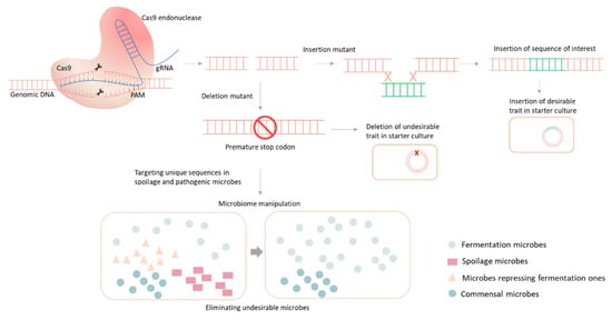 CRISPR-Cas9-mediated gene editing and its possible applications in food fermentation. The precise gene editing can be utilised for improving of the starter culture by deletion of undesirable traits or insertion of desirable traits. CRISPR-Cas9 technology could be utilised for microbiome engineering by targeting unique sequences and selectively eliminate spoilage and undesirable microbes from the community.