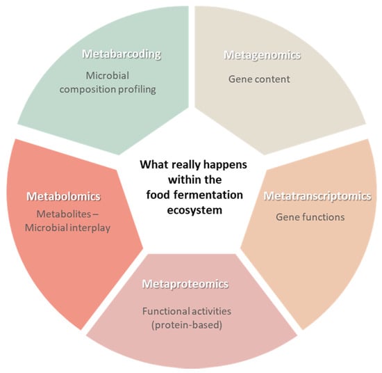 Several studies have combined meta-transcriptomic analysis, which targets actively expressed genes under specific conditions, with meta-barcoding to decipher the core functions of the detected microbiota that are associated with metabolomic changes affecting the quality properties of fermented foods [100]. The two approaches were combined to study the structure and function of the core microbiota in Chinese soy sauce aroma type liquor production and facilitate understanding of the flavour development in the product as a two-stage process involving yeast initially for the production of ethanol, followed by a functional shift for the production of organic acids by the action of Lactobacillus [101]. De Filippis et al. [102] used a combinatorial approach involving meta-transcriptomic analysis to facilitate understanding of the ripening process of Italian cheese and possibilities for ripening acceleration. The obtained results indicated the roles of non-starter LAB in ripening-related activities and the temperature increase-related modulations on the microbiota structure and function during maturation for optimisation of production efficiency and product quality.