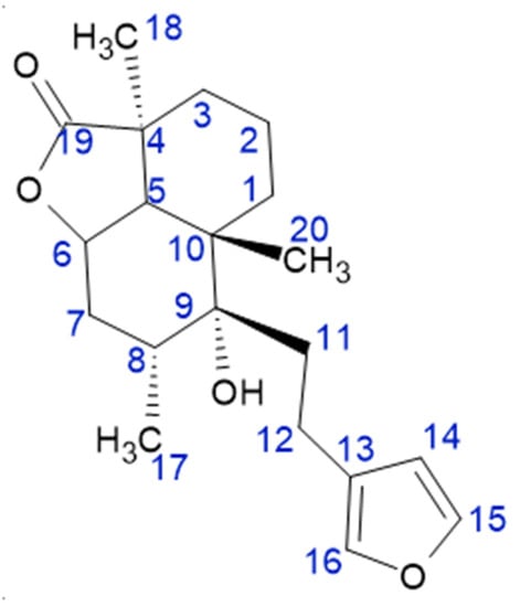 Earlier phytochemical investigation of M. vulgare led to the characterization of several labdane diterpenoids with marrubiin (Figure 1) as the main component [3]. Some authors [4] found an antispasmodic potential of marrubiin when administered to rabbit jejunum. Ca2+ antagonist potential, anticoagulant, and antiplatelet activities have also been detected [1,5]. Other authors [6,7] demonstrated that marrubiin exhibited a global inhibitory effect on different phlogistic agents. This labdane lactone also has the effect of increasing insulin secretion and LDL-cholesterol [8].