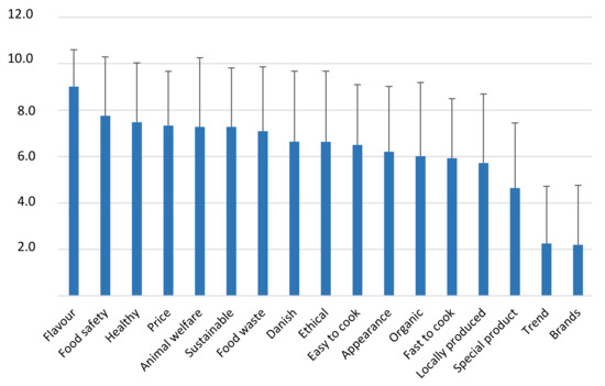 To identify the drivers of choice for plant-based meat alternatives, the respondents were asked to rate different factors related to intrinsic and extrinsic factors (Figure 1). Taste and flavour (in Danish this is the same word) were rated as the most important factor, indicating that the sensory quality is crucial. Food safety, health and price are also important factors related directly to the respondents, while sustainability and animal welfare are important external factors. In contrast, trends and brands scored low and were considered unimportant for the respondents.