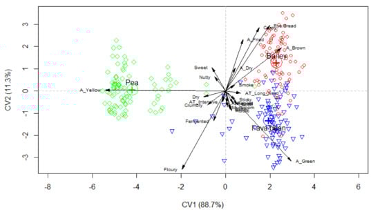Different sensory descriptions of three types of tempeh (Fava bean: blue triangle; Pea: green rhombus; and Barley: red circle) assessed by rate-all-that-apply and analysed using canonical variate analysis.