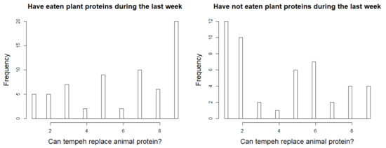Additionally, the consumers were asked to what extent they thought tempeh could replace animal protein. As seen in Figure 3, the answer clearly depended on whether or not they had eaten plant proteins for dinner during the past week. Those who had eaten plant protein during the past week were clearly positive about substituting animal protein with tempeh, while the opposite was the case for those who had not eaten plant protein for dinner.