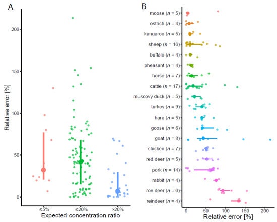 In Figure 1B, the RQE is shown for each of the 19 species detected by DNA metabarcoding. For eight mammalian (moose, kangaroo, sheep, buffalo, horse, cattle, hare, and goat) and five poultry species (ostrich, pheasant, Muscovy duck, turkey, and goose), the median RQE was <50%. For four mammalian species (red deer, pork, rabbit, and roe deer) and chicken, the median RQE was between 50% and 100%. The highest median RQE was obtained for reindeer (133%).