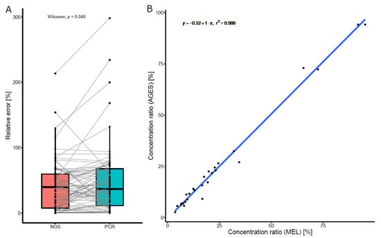 RQE was also calculated for real-time PCR (difference between the ratio of the species contained in the reference sample (Table 1, column 3) and the ratio of DNA (%) determined by real-time PCR (Table 1, column 5), divided by the ratio of the species contained in the reference sample (Table 1, column 3)). The boxplot in Figure 2A shows the distributions of RQE determined by DNA metabarcoding and real-time PCR. Median and interquartile ranges for NGS and PCR errors are 39.7% (7.8%–59.9%) and 36.9% (11.4%–67.9%), respectively, indicating that the two distributions largely overlap.