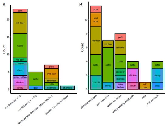 Comparison of our results, obtained by DNA metabarcoding and real-time PCR and/or the DNA array, with the food ingredient lists revealed multiple discrepancies (Table 2). In a number of commercial food products, species that were not given on the food label were detected by both DNA metabarcoding and real-time PCR and/or the DNA array. Most frequently, the DNA of undeclared species was found in high ratios >5%, indicating that the replacement of meat species by cheaper alternatives is an ongoing food fraud issue. For some products, the species detected were declared but the DNA ratios determined did not correspond with declaration (“declared and detected, ratio suspicious”). In further products, the DNA of undeclared species was detected in traces between 1% and 5%, which were possibly contained due to production-related carry-over. In only one product (wild boar sausage 5), a species declared (chamois) was not detected. Figure 3A summarizes the number of mislabeled species by type of fraud in commercial foodstuffs, Figure 3B the number of mislabeled species by type of food product.