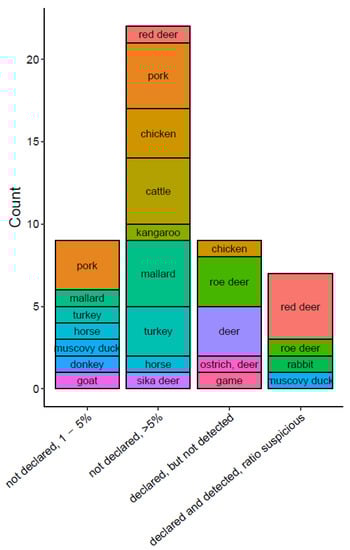 In a high number of commercial pet food products, undeclared species were detected by each of the methodologies applied. Most frequently, undeclared species, were present at a ratio >5%, e.g., pork, chicken, cattle, mallard, and turkey (Figure 4). These animal species of lower commercial value mainly replaced deer, either totally or in part. The results show that inspection of pet food for authenticity has high relevance.
