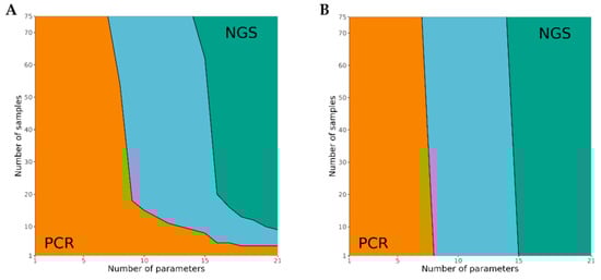Break-even point analysis of NGS-metabarcoding and real-time PCR for the qualitative identification of bird and mammal species. The left-most orange area corresponds to combinations of sample number/parameter number for which PCR is always cheaper than NGS. The right-most green area corresponds to combinations for which NGS is always cheaper than PCR. The middle blue zone corresponds to combinations for which the cost difference largely depends on the degree of multiplexing of the PCRs. NGS costs were calculated for two exemplary laboratories: (A) a laboratory running exclusively meat-metabarcoding runs, and (B) a laboratory running full-capacity sequencing runs, for example, mixing samples with other type of assays.