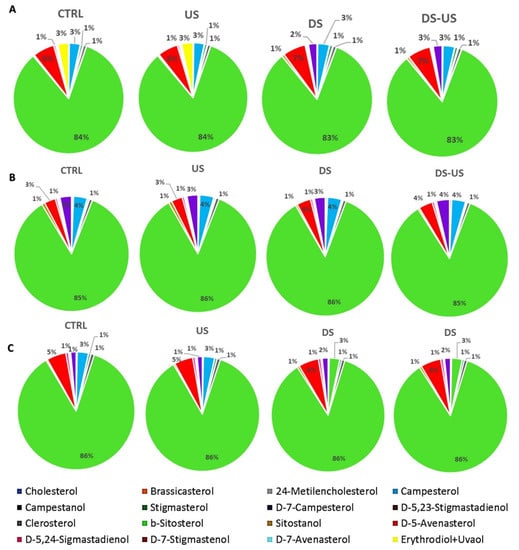 Sterol composition (%) of Peranzana (A), Canino (B) and Coratina (C) EVOOs, treated by the different processes (CTRL = control test, US = ultrasound test, DS = destoned test, DS-US = destoned-ultrasound test).