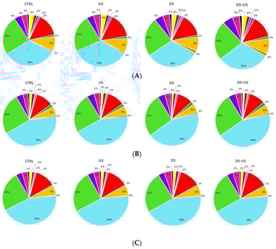 Triglyceride composition (%) of Peranzana (A), Canino (B), and Coratina (C) EVOOs, treated by the different processes (CTRL = control test, US = ultrasound test, DS = destoned test, DS-US = destoned-ultrasound test). LLL = trilinolein-glycerols, PLLn = palmitoyl-dilinoleoyl-glycerols, OLLn = linolenoyl-oleoyl-linoleoyl-glycerols, PLLn = dilinoleoyl-palmitoleoyl-glycerols, PoLL = dilinoleoyl-palmitoleoyl-glycerol, OOLn = dioleoyl-linolenoyl-glycerols, PoOL = palmitoleoyl-oleoyl-linoleoyl-glycerol, PoPoO = dipalmitoleoyl-oleoyl-glycerol, PPoPo = dipalmitoleoyl-palmitoyl-glycerol, PPoL = palmitoyl-palmitoleoyl-linoleoyl-glycerol, LnPP = dipalmitoyl-linoleoyl-glicerol, PLO = palmitoyl-linoleoyl-oleoyl-glycerol, POO = dioleoyl-palmitoyl-glycerol, OOO = triolein-glycerols, SLL = dilinoleoyl-stearoyl-glycerol, PoOO = dioleoyl-palmitoleoyl-glycerol, SPoL = stearoyl-palmitoleoyl-linoleoyl-glycerol, POP = dipalmitoyl-oleoyl-glycerol, PoOP = palmitoyl-palmitoleoyl-oleoyl-glycerol, SOLn = stearoyl-oleoyl-linoleoyl-glycerols, SOO = dioleoyl-stearoyl-glycerol, POS = palmitoyl-oleoyl-stearoyl-glycerol, SPoL = stearoyl-palmitoleoyl-glycerol, SLS = distearoyl-linoleoyl-glycerols.