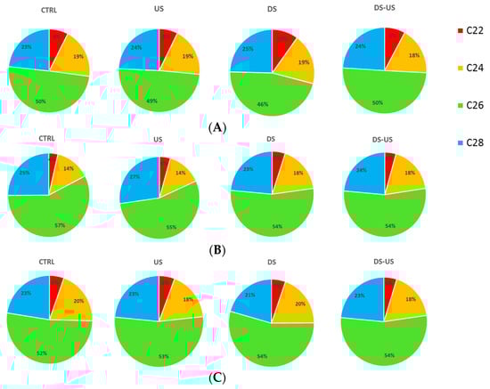 Total aliphatic alcohols (mg/kg), i.e., 1-docosanol (C22), 1-tetracosanol (C24), 1-hexacosanol (C26) and 1-octacosanol (C28), of Peranzana (A), Canino (B) and Coratina (C) EVOOs, treated by the different processes (CTRL = control test, US = ultrasound test, DS = destoned test, DS-US = destoned-ultrasound test).