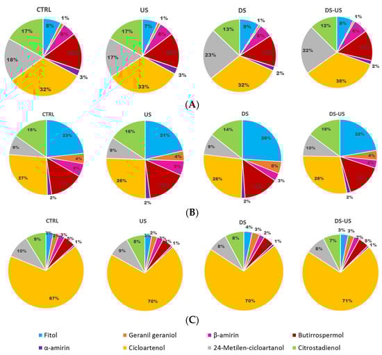 Total triterpene alcohols (mg/kg) of Peranzana (A), Canino (B), and Coratina (C) EVOOs, treated by the different processes (CTRL = control test, US = ultrasound test, DS = destoned test, DS-US = destoned-ultrasound test).