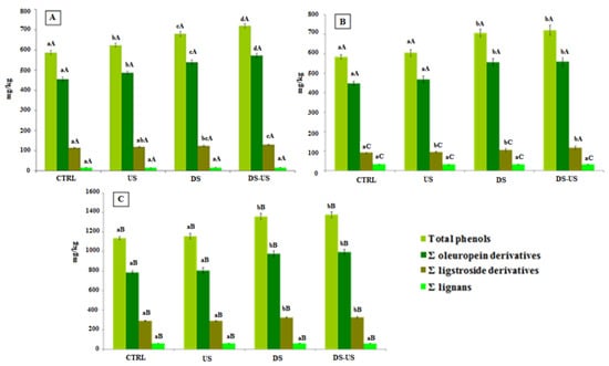 Phenolic composition (mg/kg) of Peranzana (A), Canino (B) and Coratina (C) EVOOs. Phenolic content was expressed as total phenols, oleuropein derivatives (sum of 3,4-DHPEA, 3,4-DHPEA-EDA, and 3,4-DHPEA-EA), ligstroside derivatives (p-HPEA, p-HPEA-EDA, and ligstroside aglycone), and lignans [sum of (+)-1-acetoxypinoresinol and (+)-pinoresinol]. The data are the mean values of the three samples analyzed in triplicate ± standard deviation. For each different cultivar, the values of each phenolic group with different lower-case letters are significantly different from one another (p < 0.05). For each different test, the values of each phenolic group of the three cultivars with different upper-case letters are significantly different from one another (p < 0.05). CTRL = control test, US = ultrasound test, DS = destoned test, DS-US = destoned-ultrasound test.