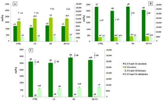 Volatile composition (μg/kg) of Peranzana (A), Canino (B) and Coratina (C) EVOOs. Volatile content was expressed as C5 and C6 saturated and unsaturated alcohols (sum of 1-pentanol, 1-penten-3-ol, (E)-2-penten-1-ol, (Z)-2-penten-1-ol, 1-hexanol, (Z)-2-hexen-1-ol, (E)-2-hexen-1-ol, (Z)-3-hexen-1-ol, and (E)-3-hexen-1-ol), primary axis; C6 esters (sum of hexyl acetate and (Z)-3-hexenyl acetate), primary axis; C5 and C8 ketones [3-Pentanone, 1-Penten-3-one and 6-Methyl-5-hepten-2-one], primary axis; C5 and C6 saturated and unsaturated aldehydes (sum of pentanal, (E)-2-pentenal, hexanal, (E)-2-hexenal and (E,E)-2,4-hexadienal), secondary axis. The data are the mean values of the three samples analyzed in triplicate ± standard deviation. For each different cultivar, the values of each volatile group with different lower-case letters are significantly different from one another (p < 0.05). For each different test, the values of each volatile group of the three cultivars with different upper-case letters are significantly different from one another (p < 0.05). CTRL = control test, US = ultrasound test, DS = destoned test, DS-US = destoned-ultrasound test.
