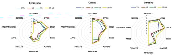 Sensorial profile of Peranzana, Coratina, and Canino EVOOs. CTRL = control test, US = ultrasound test, DS = destoned test, DS-US = destoned-ultrasound test.