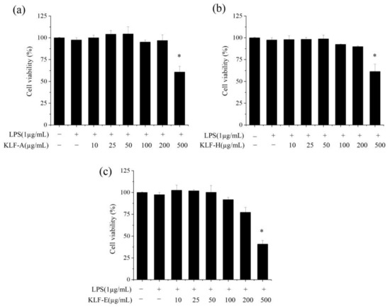 To evaluate and compare the potential anti-inflammatory effects of the three krill lipid fractions, RAW 264.7 macrophages stimulated with LPS were selected as the cell model. Firstly, appropriate dosage levels at which all the krill lipid fractions showed no cytotoxic need were determined to ensure enough cell viability. The effects of KLF-A, KLF-H and KLF-E at different concentrations in the culture (10, 25, 50, 100, 200 and 500 µg/mL) on the viability of RAW264.7 cells stimulated with LPS were investigated quantitatively, and the results are shown in Figure 1.