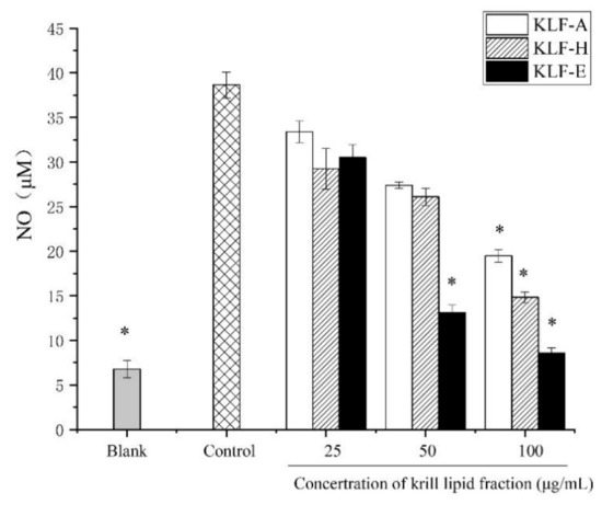 Effect of different concertrations of three krill lipid fractions on nitric oxide (NO) production in RAW264.7 cells with LPS stimulation. Blank group referred to the untreated cells; cells treated with LPS alone were considered as the control group. * p < 0.05 versus the control group; one-way analysis of variance (ANOVA) combined with Duncan’s multiple-range test was used to analyze the significance. Abbreviations: LPS, lipopolysaccharide; KLF-A, the krill lipid fraction extracted with acetone in the first step; KLF-H, the krill lipid fraction extracted with hexane in the second step; KLF-E, the krill lipid fraction extracted with ethanol in the third step.