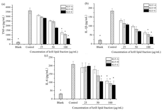 Figure 3a demonstrated the effect of three krill lipid fractions on TNF-α secretion in LPS-induced inflammatory cells. Stimulation with LPS in RAW 264.7 macrophages resulted in an order of magnitude higher TNF-α production (3623.89 pg/mL) compared with the blank group (226.11 pg/mL). It can be also seen that all of the groups treated with krill lipid fraction exhibited lower TNF-α production induced by LPS. For one specific treated group, a higher concentration of krill lipid fraction was used, and a higher reduction of TNF-α level was observed. At the highest dosage of 100 μg/mL, TNF-α secretion levels of the cells treated with KLF-A, KLF-H and KLF-E before LPS stimulation decreased to 1237.78, 1062.78 and 607.22 pg/mL, respectively. Bonaterra et al. has confirmed that krill oil attenuated the release of TNF-α by inhibiting the binding of LPS to toll-like receptor 4 using differentiated THP-1 macrophages activated by LPS [9]. A downregulation effect of TNF-α mRNA expression was also observed in inflammatory human colorectal adenocarcinoma cell lines (Caco2, HT29) [10]. Our results were consistent with these studies. Notably, the KLF-E group showed the most significant inhibitory effect on the TNF-α production, followed by the KLF-H and KLF-A group at the same concentration. Figure 3b,c shows the cytokine production of IL-1β and IL-6 in RAW 264.7 macrophages, respectively. Similar to TNF-α, levels of IL-1β and IL-6 in the control group were remarkably increased by 8.7- and 6.7-fold more than those in blank group. However, these levels were significantly decreased by krill lipid fraction treatment. Additionally, higher dosages of krill lipid fractions administrated to RAW 264.7 exhibited stronger inhibition effects on IL-1β and IL-6 production. There was a slight difference with the results of TNF-α that, at the lowest level of 25 μg/mL, the three krill lipid fractions provided insignificantly different IL-1β and IL-6 production levels, while KLF-E showed the strongest inhibition effect on IL-1β and IL-6 release among the three fractions at both 50 and 100 μg/mL.