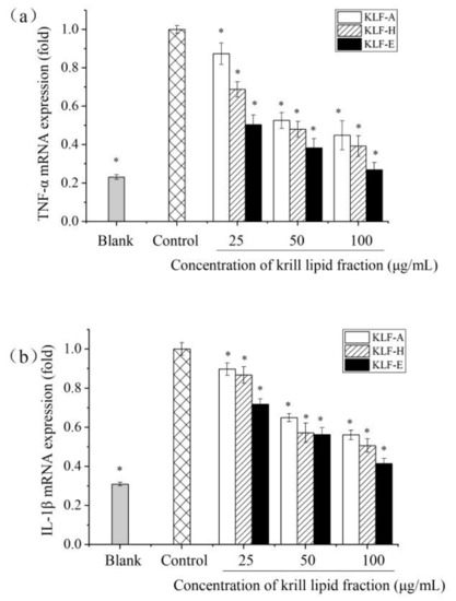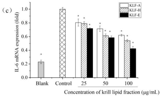 Effect of three krill lipid fractions on mRNA expression of cytokine (a) TNF-α, (b) IL-1β and (c) IL-6 in RAW264.7 cells with LPS stimulation. Blank group referred to the untreated cells; cells treated with LPS alone were considered as the control group. * p < 0.05 versus the control group; one-way analysis of variance (ANOVA) combined with Duncan’s multiple-range test was used to analyze the significance. Abbreviations: LPS, lipopolysaccharide; KLF-A, the krill lipid fraction extracted with acetone in the first step; KLF-H, the krill lipid fraction extracted with hexane in the second step; KLF-E, the krill lipid fraction extracted with ethanol in the third step.